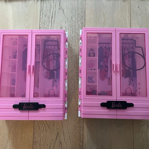 Barbie legetøj med klædeskab og tilbehør i pink og blå farver. Indeholder flere rum til opbevaring af tøj og tilbehør samt spejle. Designet til børn med fokus på rolleleg og opbevaring af Barbie-tøj og -tilbehør.