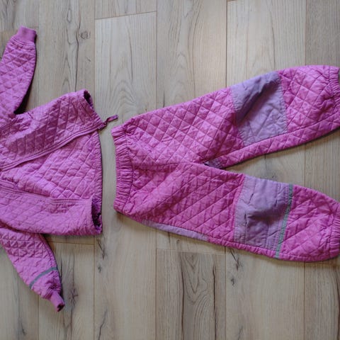 Der er et lille hul på højre knæ men kan sagtens bruges. Samlet pris for både jakke og bukser.