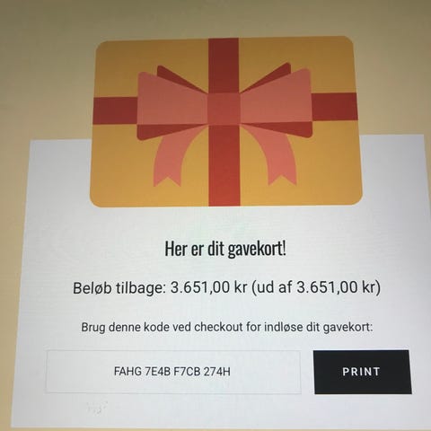 Tilgodehavendebevis/gavekort pålydende 42.750 kr. sælges til fast pris 38.500 kr.