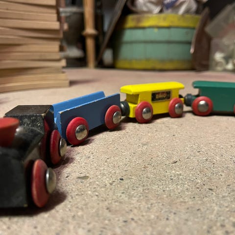 BRIO legetøjssæt bestående af forskellige trætog, vogne, figurer og tilbehør. Sættet indeholder blandt andet lokomotiver, passagervogne, træfigurer, trætræer og små køretøjer. Materialet er træ og plastik, designet til børn. Leveres i en grøn opbevaringskasse.