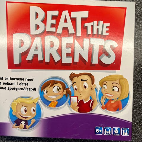 Beat the Parents brætspil med spørgsmålskort og spillebrikker. Passer til børn fra 6 år og op. Spillet indeholder flere spillekort og instruktioner til spillets regler.