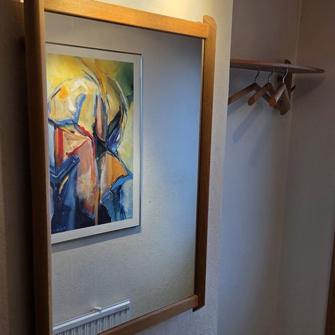 2 super flotte gedigne hattehylder med knager designet af Bengt Ek. Hver måler 1 meter i længden. 10 bøjler medfølger nogle med brugsspor og uden elastikker i enderne. Sælges helst samlet og skal afhentes.