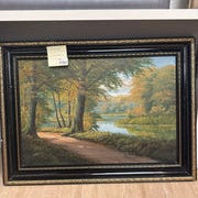 Det står i rigtig pæn stand uden huller eller revner i lærredet. Farverne er klare, og motivet har en varm og rolig atmosfære. Leveres i en smuk, original guldramme med let patina, som passer perfekt til motivet.