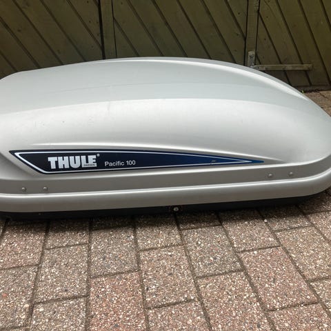 Ingen logo, da den fulgte med ved køb af en Peugeot, men det er altså en Thule Pacific base, formoder at det er en 600. Den er ca. 1.85 i højden. Masser af brugspor, men fejler intet funktionelt. En enkelt nøgle følger med.