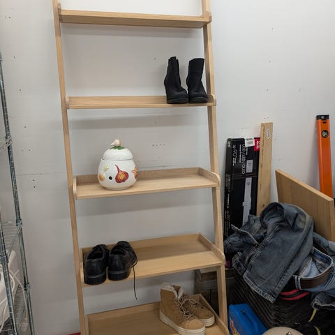 Lysegrå system laminat reol med lettere brugsspor. Massive hylder der kan klare vægt. Så gode og solide.