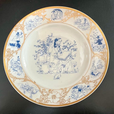 Den flyvende kuffert og Stoppenålen - platter med H. C. Andersen motiver. Platterne er 20,5 cm. i dia. og begge er med guldkant.