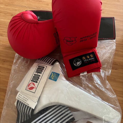 Brugt en fem gange. Handsker til karate. Str M i børne str. Der står min søns navninden i, men det kan fjernes eller overskrives. Købt for 259kr og sælges for 100kr
