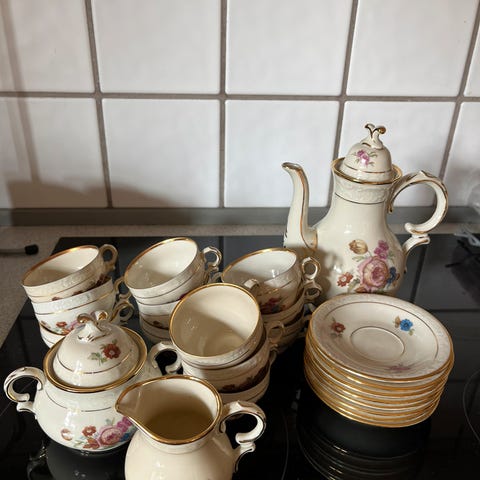 Porcelæn, Mokkastel, Kaffestel, mini kaffestel, dukkestel, Royal Copenhagen, KPM, Rosenborg, Vintage, samleobjekt, retro, smukt og velholdt mokkastel til 12 personer: 12 dessert tallerkener/ kage tallerkener, 12 underkopper, 12 kopper, sukkerskål, flødekande og mokkakande. Kopper, underkopper, sukkerskål, flødekande og mokkakande alt i miniudgave/ halv størrelse af det normale kaffestel. Mega nuttet. Du vil ikke kunne stå for det!Stellet har strukturmønster i selve porcelænet under glasuren samt blomstermotiv og guldkanter. Stellet er i superfin stand. 2 kagetallerkener har et lille afslag/skår. Det samme gælder 2 kopper - dog så småt, at man ikke lægger mærke til det - se fotos af disse 4 dele. Sælges kun samlet og ved afhentning.