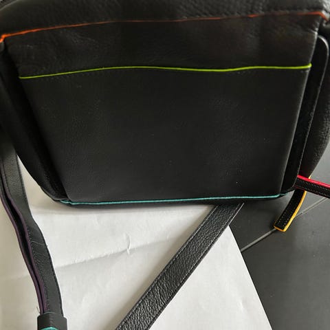 Tasken har en hvid farve og en justerbar skulderrem. Den lukkes med en metalspænde og har flere rum til opbevaring.