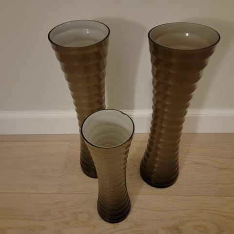 Olivengrønne/brune. Hvide indvendig. To dråbeformede vaser ca. 19 cm høje.