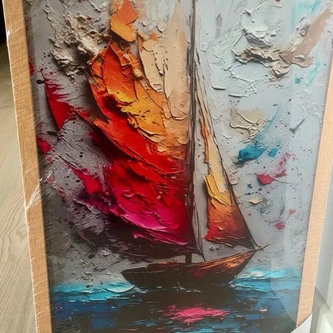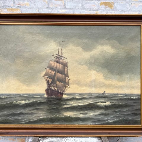 Maleri af et sejlskib ved solnedgang med detaljeret gengivelse af havet, himlen og landskabet. Maleriet viser et sejlskib på bølgerne med solens lys, der reflekteres i vandet. Farverne domineres af nuancer af blå, lilla, orange og gult, der skaber en stemningsfuld atmosfære.