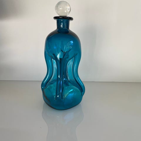 Høj og sjælden Kluk Kluk Karaffel i blåt glas (32 cm høj) med klar kugleprop og 6 tilhørende glas.