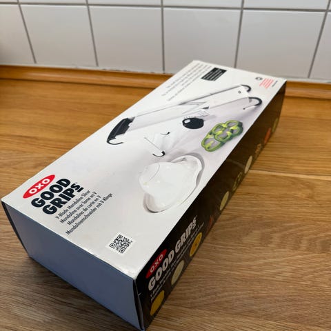 OXO Good Grips Mandolinjern i hvid plast. Køkkenredskab til skæring af grøntsager og frugt i skiver. Inkluderer skærme og håndtag for sikker brug.
