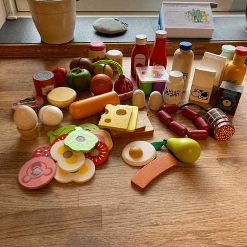 trælegetøj bestående af trægrøntsager og oste. Legetøjet inkluderer gulerødder, en stor gulerod, tomater og oste i træ. Designet til børn som et pædagogisk og kreativt legetøj.