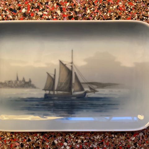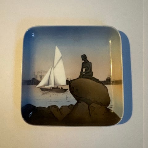 Royal Copenhagen Fajance Fyrtårn firkantet fad med motiv af Den Lille Havfrue og sejlskib. Fadet er lavet i fajance og har en firkantet form.