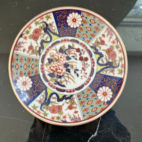 Porcelæn tallerken med blomstermotiv i orange og blå farver. Tallerkenen har en rund form med bølget kant og dekorative detaljer. Velegnet til servering eller som dekorativt element.