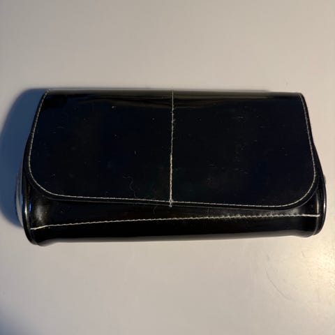 Asiatisk håndtaske / clutch / toilettaske med hank og kæde i satin med hård kant / ramme. Indeni 3 rum og lynlås ~ sort satinfoer.