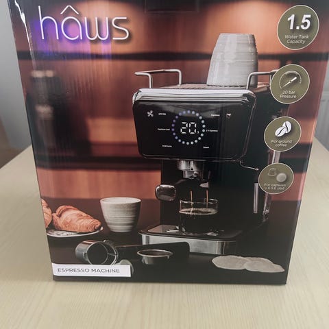 Hâws espressomaskine der kan det hele. Den kan brygge kapsler, espresso cold, Americano, enkelt espresso, dobbelt espresso, E.S.E POD, og har også mælkeskummer. Jeg har brugt maskinen 1 gang, så den er som ny.