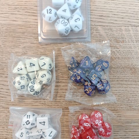 Helt nyt terningesæt til pnp-/bordrollespil i metal med farverne guld og grøn. I original sort metalæske.