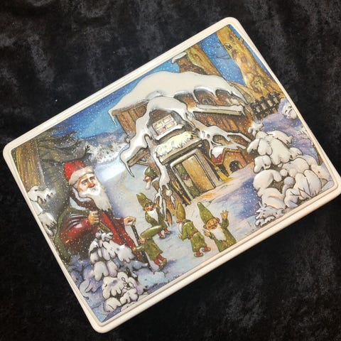 Kagedåsen har nogle buler, men er ellers pæn og i pæne farver. Se billeder for biler.