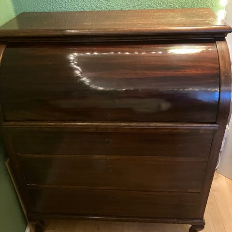Flot chatol i birkefiner med mange skuffer og klapbord. Ca år 1900