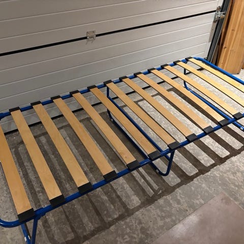 Gæsteseng der kan slås sammen. Tynd original skumgummimadras medfølger.