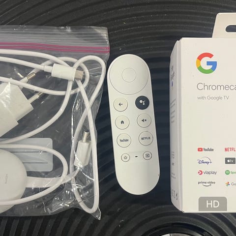 Google Chromecast med HDMI-udgang og USB-strømkabel. Enheden er sort og designet til at streame indhold til fjernsyn via HDMI-porten. USB-kablet bruges til at forsyne Chromecast med strøm.