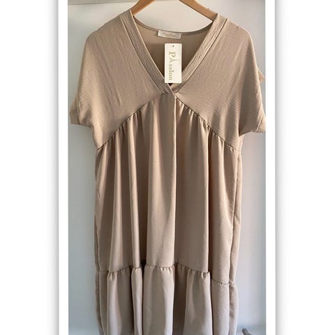 Med knapper og bindebælte der kan bindes på ryggen eller foran. Ærmer i trekvart længde.