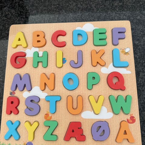 Legetøjsbogstav puslespil i træ med farverige bogstaver
