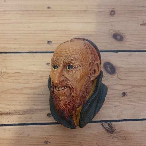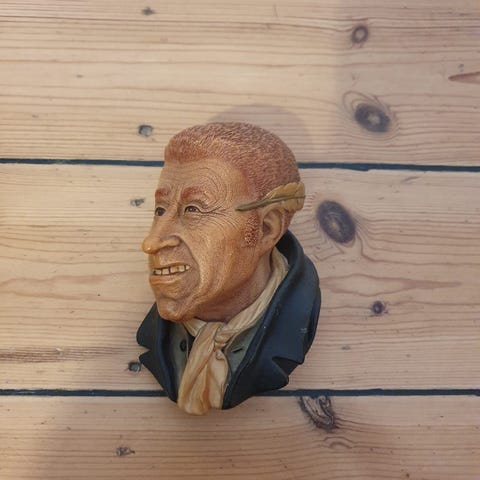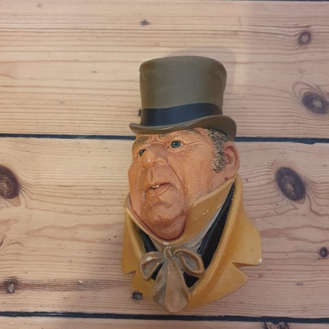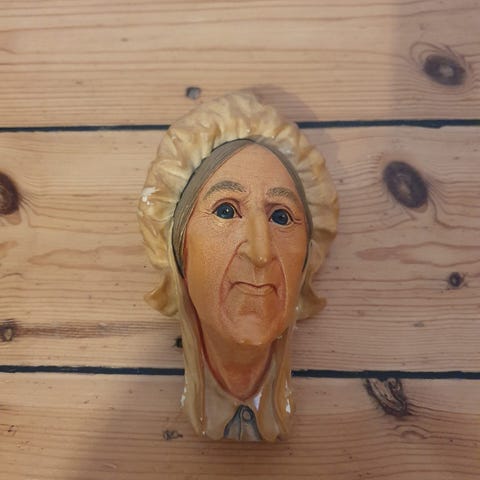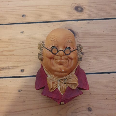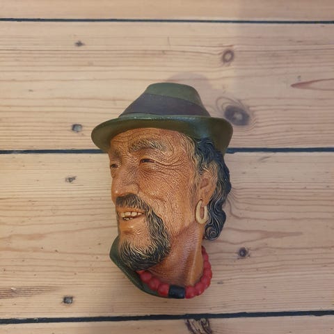 Bossons hoved i kridttøj.H 15 cm, B 13 cm.Få brugsspor, gå til varen for flere billeder.