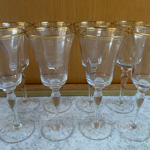Ida vinglas med guldkant.H 14,5 cm, Dia 9 cm.Har 12 styks på lager, alle er velholdte. Prisen er stykket. Gå til varen, for flere billeder.(Rødvin/snaps/vandglas).