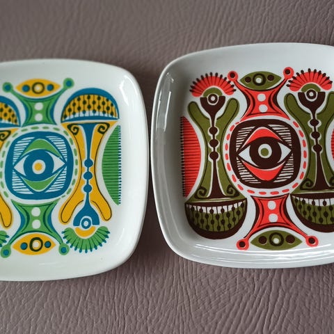 2 styks Friggjo tallerkener fra 90'erne.Dia 30 cm.Begge har aldersrelateret brugsspor, i form af ridser fra bestik. Sælges samlet.