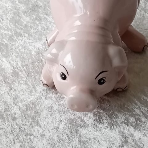 Mand i gyngestol sparegris - mangler låg i bunden.H 14 cm, B 9 cm.Flot, uden skår. Gå til varen, for flere billeder.