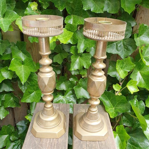 Engelske lysestager i messing.H 17 cm, B 10 cm.Sælges som sæt. Gå til varen, for flere billeder.
