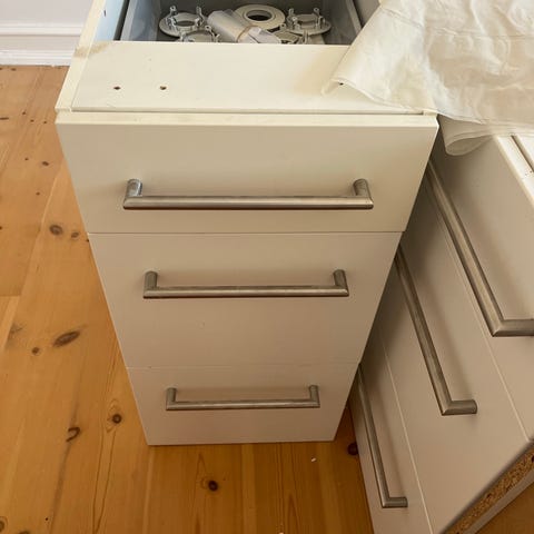 Skuffer til køkkenskab i plastik.H 10 cm, B 16,5/20 cm, D 13,5 cm.Har 9 styks på lager, prisen er stykket. Gå til varen, for flere billeder.