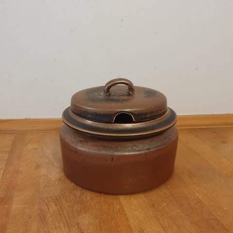 Gryde med låg fra Ruska.H 16 cm, B 20 cm, hul 15 cm.Flot og velholdt, uden skår eller lignende. Gå til varen, for flere billeder.