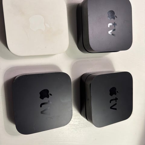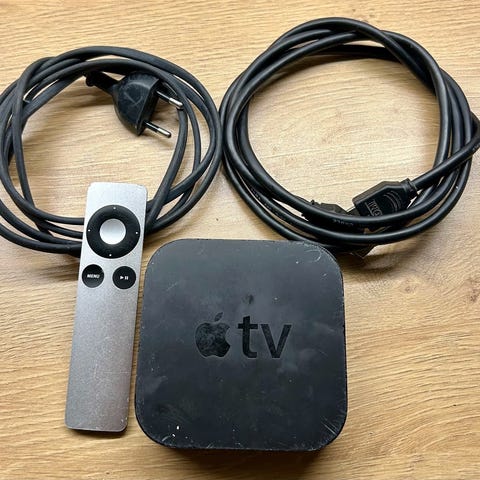Apple TV streaming-enhed med fjernbetjening. Enheden er sort og leveres med fjernbetjening, strømforsyning og tilhørende kabler. Designet til at streame indhold til TV fra forskellige kilder.