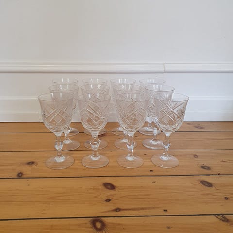 Vinglas i krystal med slibninger.H 16 cm, Dia 7,5 cm.Har 10 styks på lager, prisen er stykket.Flotte og velholdte, uden skår eller lignende.