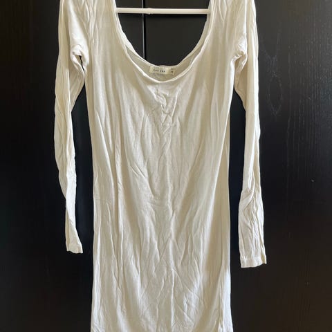 Lang bluse eller kort kjole, i lyseblå/lysegrå. Luftigt vævet med materialer der glimter/reflekterer lyset, og ribstof ved ærmer og forneden.