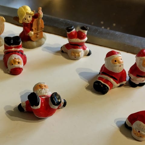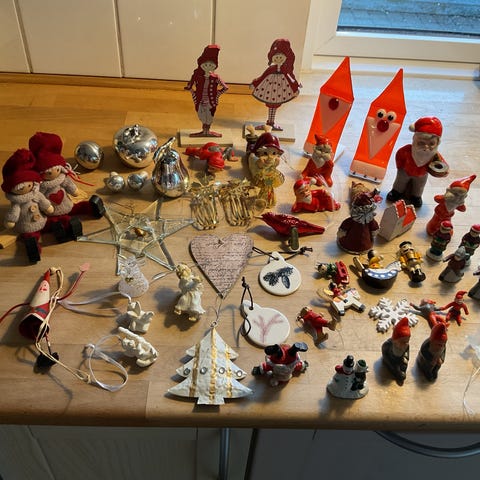WMF juledekorationer til brug i julen. Sættet indeholder forskellige figurer og ornamenter i forskellige materialer, herunder metal og tekstil. Dekorationerne inkluderer nisser, snemænd, lysestager og andre julemotiver i forskellige størrelser og farver.