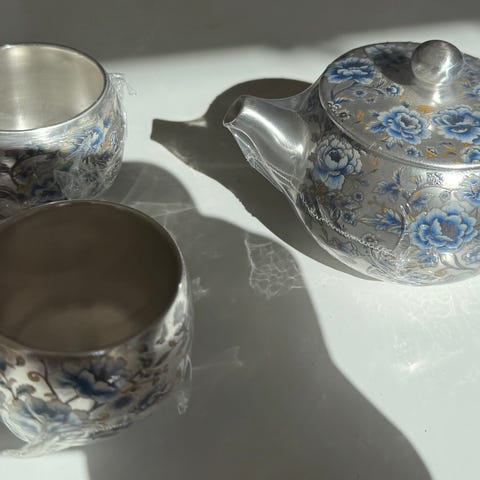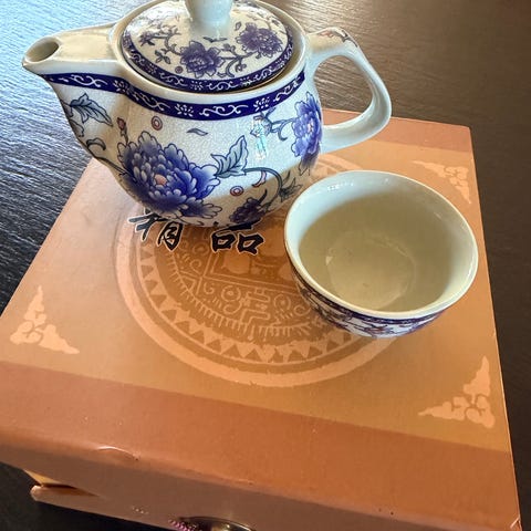 Kinesisk Porcelæn tekande med blå blomstermønster og låg med greb. Tekanden har et håndtag i flet og en rund form. Den er velegnet til brygning og servering af te.