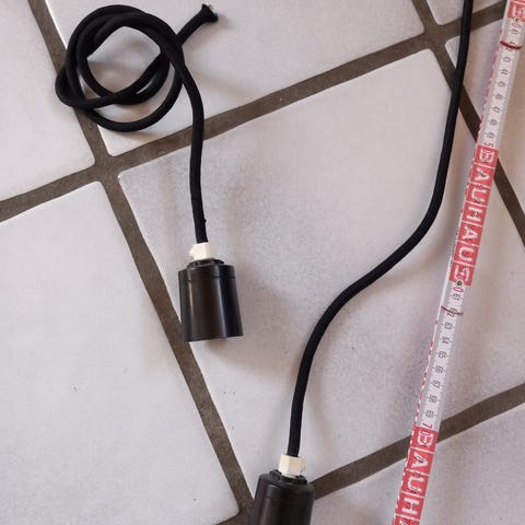 Sort lampeophæng med tre fatninger til pærer. Passer til standard fatninger og kan anvendes til forskellige typer belysning. Kabel og fatninger er sortfarvede.