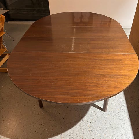 Spændende projekt til overtagelse - et originalt rundt bord i teaktræ med udtræk og sortmalede ben / sarg. Halvdelen af bordpladen har fået limet sildebensparkettet på - den anden halvdel skal have limet sildeben på - men når det er gjort kan bordet samles. Sildebenene er fra Hørning floors i ubehandlet Eg.