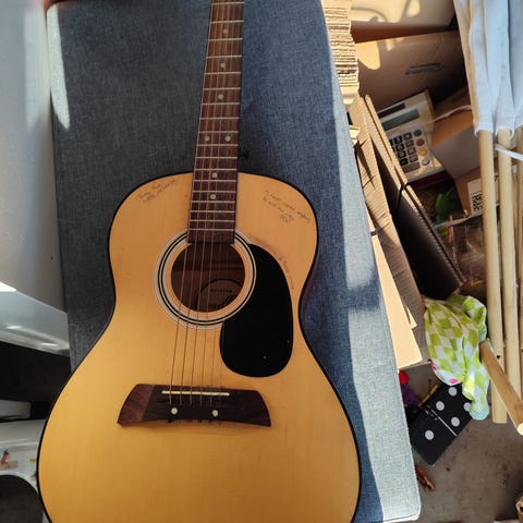 Akustisk guitar i sort farve med medfølgende taske og ekstra guitarstrenge. Næsten ikke brugt.