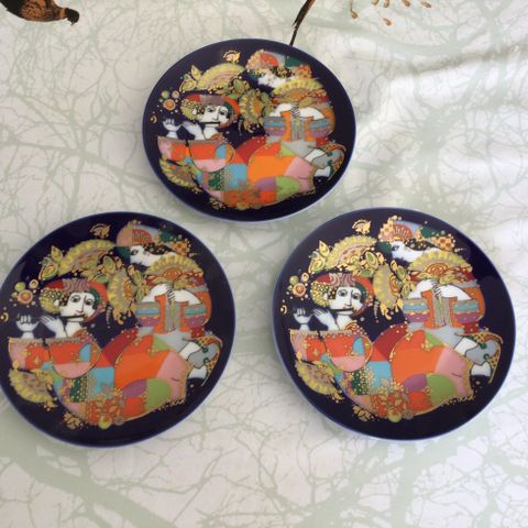 Rosenthal Orientalsiche Nachtmusik Nr. 1 vægplade dekoration med design af Bjørn Wiinblad. Pladen har farverigt mønster med figurer og ornamenter på en mørk baggrund. Velegnet til vægophæng som dekorativt element.
