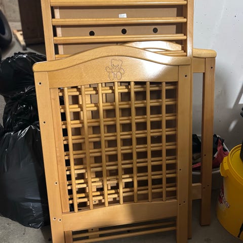 Barnesengen er lavet af træ med en hvidlakeret overflade. Den har skridsikre stænger og en madras. Der er et lille afslag nederst på det ene ben. Der mangler nogle skruer til sengen,Afhentes i:,Røde Kors Tuborgvej / København NV (101),Bemærk at mail, chat og beskeder ikke besvares, og varen skal købes på knappen "Gå til varen"