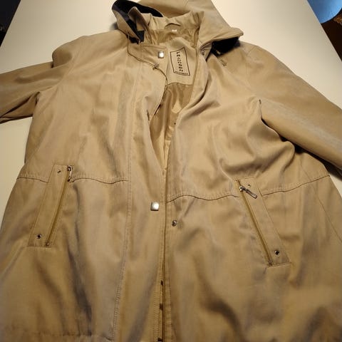 Jakke, str. 38, Frandsen outerwear, Beige, Polyester. Foeret sommerjakke med mange smukke detaljer. Lynlåslukning og trykknaplukning foran. Lommer forneden med lynlåslukning. Indvendig er der lomme med knaplukning til mobiltlf. og 1 lille lomme til småting. På kraven, over skuldrene og forneden i ærmerne er der smukke stikninger. Kraven kan gøres større og snøres til, så den luner omkring hals og ører. Elastisk snørelukning forneden af jakken. Jakken har et lysetødt skær på billederne, men den er helt beigefarvet i virkelighrden.Fin stand.