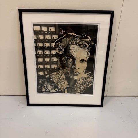 Indrammet kunsttryk med motiv af en person iført leopardmønstret tøj. Billedet måler cirka 60 cm i højden og 65 cm i bredden. Rammen er sort med gulddetaljer og viser synlige tegn på slid.