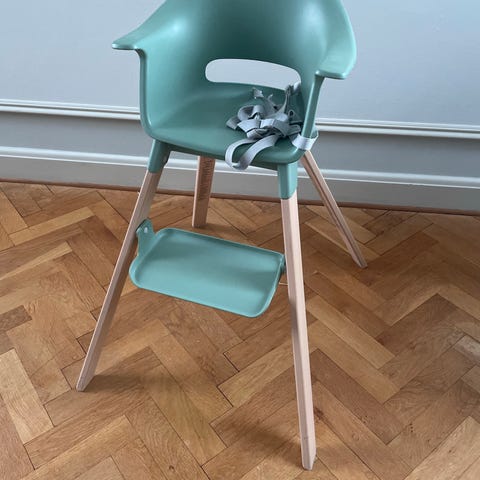 Stokke højstol i grøn farve. Højstolen er designet til børn og kan bruges ved spisebordet for at give en sikker og komfortabel siddeplads. Materialet er holdbart og let at rengøre.