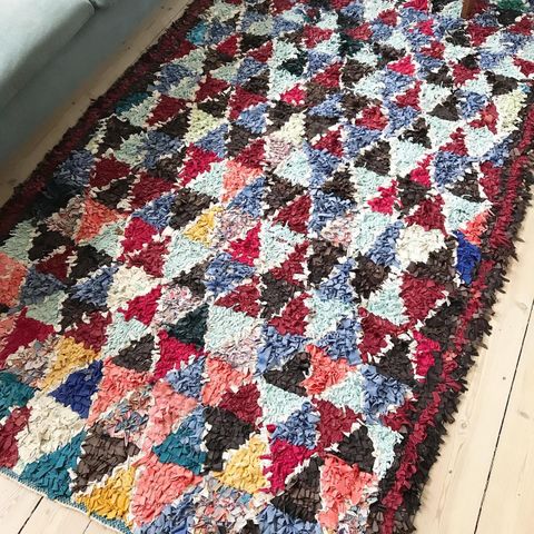 Håndlavet marokkansk Boucherouite tæppe i flotte farver. Unikt boheme look.